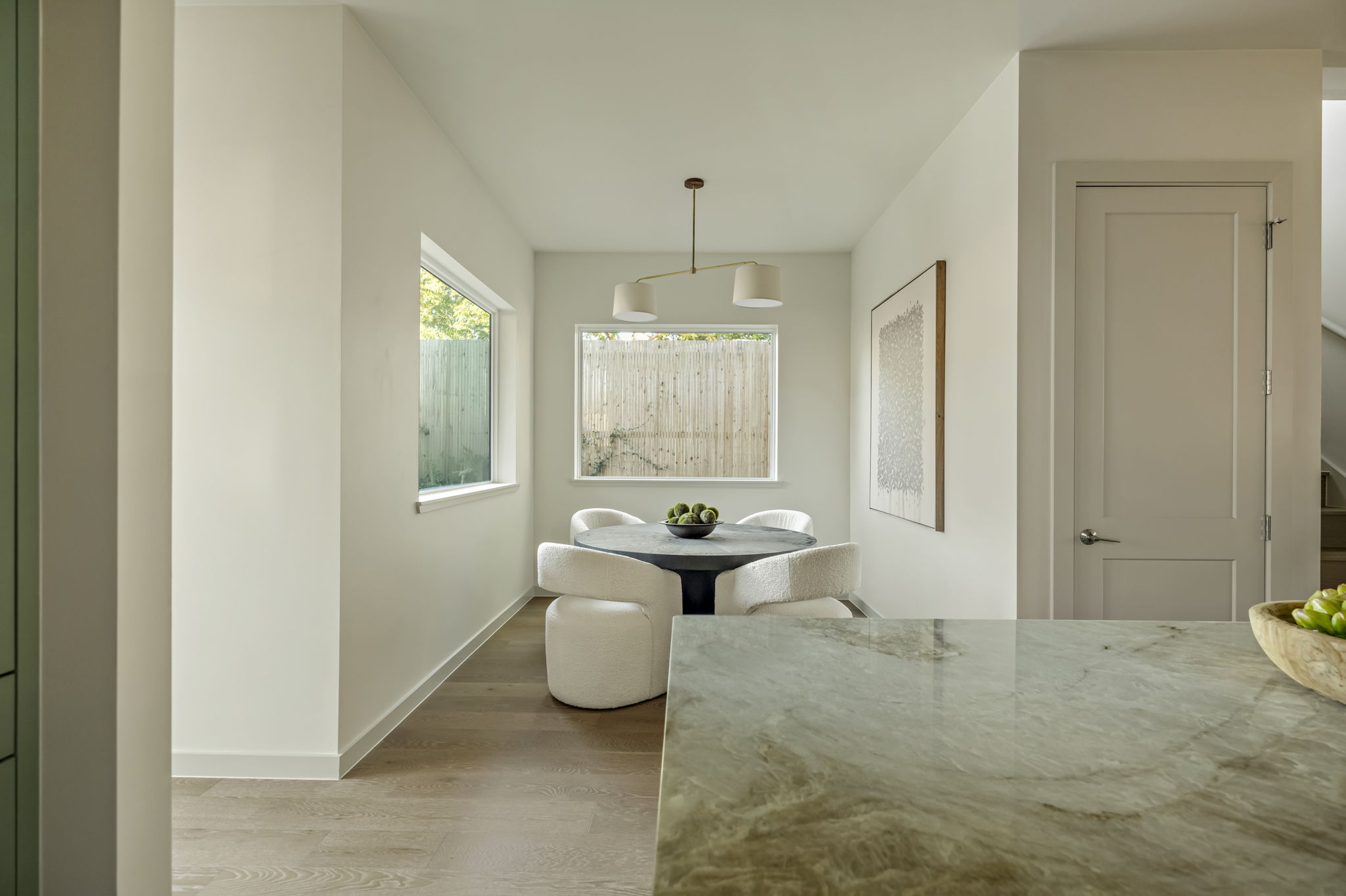Designed by the renowned Studio MRMR (Architectural Digest New American Voices in Design, 1stDibs 50) and built by Honed Homes, this newly constructed corner-lot home is just steps from Patrizi's, Este, Spread & Co, and the vibrant lineup of restaurants and shops along Manor Road. The first floor is thoughtfully designed to maximize the natural light at this corner lot location with large windows on three sides of the home to harvest a great amount of natural light. The front door opens to a nice entry vestibule that’s perfect for storage of your items from the day and allows you a brief respite before you enter the main portion of the home. The Kitchen has a U-shape to it which maximized functionality without sacrificing floor square footage and allows for people to sit at the island countertop and be part of the conversation during cooking time. The living room is off-set from the main kitchen and dining area to give a bit of privacy and seclusion for those times when you want to have some down time when others are in the kitchen or dining area. Upstairs is the vaulted primary suite with a great separate seating area, a generous walk-in closet and a bathroom with a soaking tub under the window that is perfect for relaxing after a long day. Two additional bedrooms sit among the treetops, offering a peaceful, private feel. The fully fenced and gated yard is spacious and private. Features a carport with an electric gate, plus an additional off-street parking space. Behind the walls, Honed's signature performance features extra insulation, a fresh air system, gas tankless water heater, and variable-speed HVAC system ensure year-round efficiency.